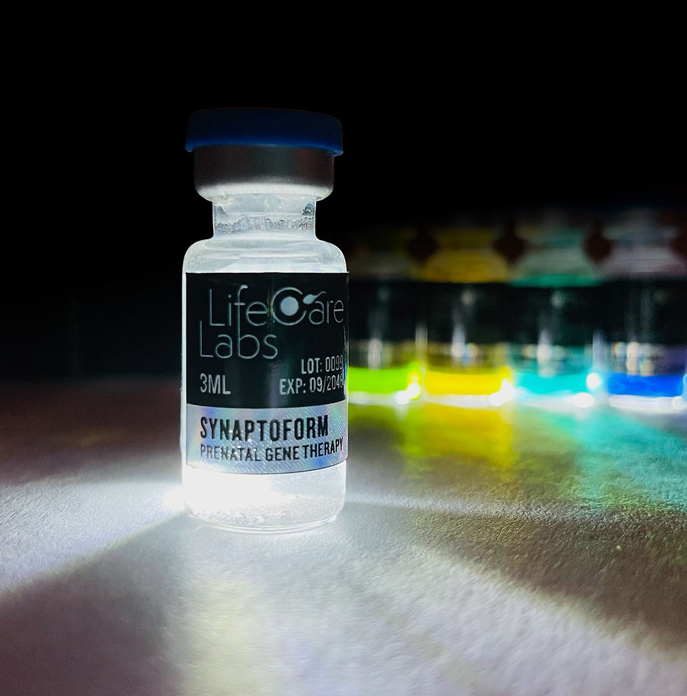 This six-vial kit was designed to support parents in proactively influencing fetal development using non-heritable gene therapies delivered in a controlled home setting. Each formulation targeted a specific developmental system, such as neuroplasticity, metabolic resilience, or innate immunity.